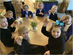 In Literacy we have been continuing our Supertato topic and have finally managed to get the Evil Pea back in the freezer where he belongs. We created superhero masks and went on a hunt around school searching for the Evil Pea! We managed to find him and put him back in the freezer. We found rocket ice lollies in the freezer so we had a little treat too!